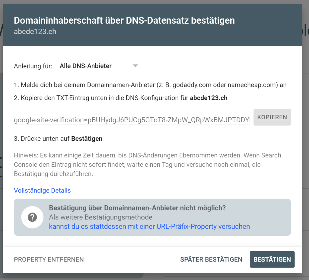 Note at this point: As DNS changes usually take some time, it may happen that "Confirmation of ownership failed" is displayed for the time being. Wait a while and try again later by selecting the relevant property under "Not confirmed" in the property selection at the top left.